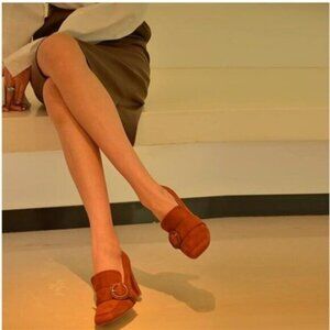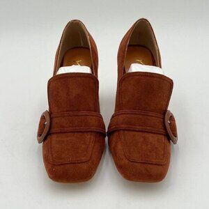 YDN Brown Chunky High Heels Square Toe Loafer Shoes Slip On Suede Office Pumps Buckle