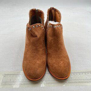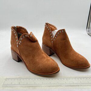 YDN Brown Studded Ankle Boot Almond Toe Block Low Heels V Cut Back Zipper Shoes