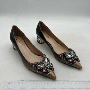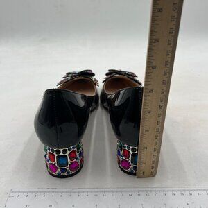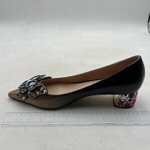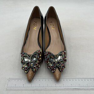 YDN Gold Black Pointed Toe Bow Pump Rhinestone Block Low Heel Butterfly Shoe