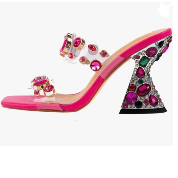 YDN Hot Pink Studded Mules Colorful Rhinestone Slippers Slip On Sandals Chunky High Heels Open Square Toe Shoes Party Prom Evening