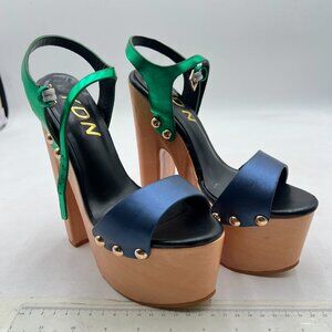 YDN Navy & Green Platform Open Round Toe Chunky High Heels Backless Sandal