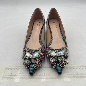YDN Snake Print Pointed Toe Bow Pump Rhinestone Block Low Heel Butterfly Shoes