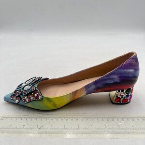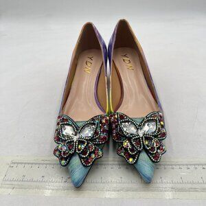 YDN Yellow Multi Pointed Toe Bow Pump Rhinestone Block Low Heel Butterfly Shoe
