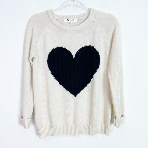 Ye mak long sleeve off-white pullover sweater with cable knit black heart.