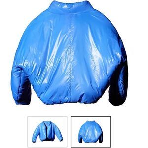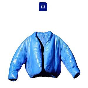 Kanye West was photographed wearing the jacket for the first time just days before its release, which came ahead of the larger Yeezy x GAP full collection. The jacket gives off a round shape and features no branding other than a Yeezy x GAP tag on the inside neckline. This blue color is apparently Kanye West's least favorite color.