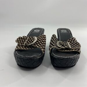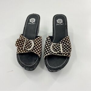 YELLOW BOX Y2K 90s Scrub Houndstooth Wedge Sandals. Leather upper and woven wedge. These have jeweled buckle on top. In excellent barely worn condition