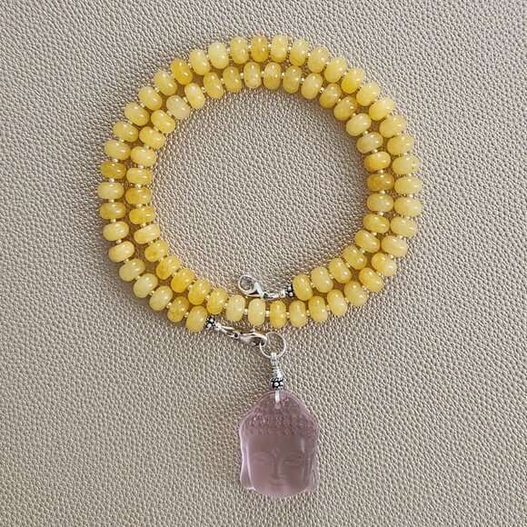 YELLOW JADE NECKLACE W/ PINK BUDDHA PENDANT--20"