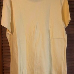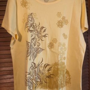 Yellow knit shirt with gold and brown butterflies and mandalas. And sparkles