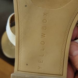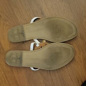 Yellowbox white with gold beaded circle and flower shapes sandals slides. Cut out designs. Lightly padded footbed. Rubber soles. Size 8. Excellent pre owned condition. Worn one time.