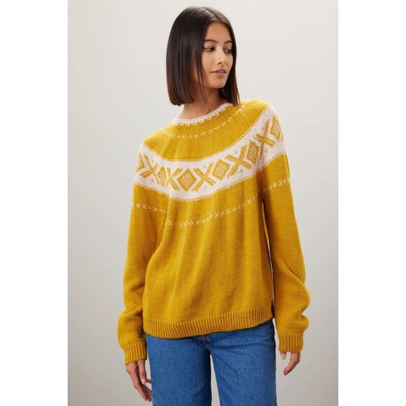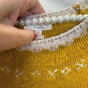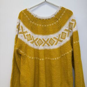 Yellow jacquard knit (75% Polyacrylic Fiber, 15% Wool, 10% Alpaca). Sweater. Long sleeves. Boat neck. Pull on. 236" from shoulder to hemline.