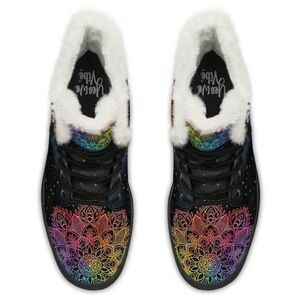 Step into cosmic comfort with these magical YES WE VIBE boots! Featuring an enchanting celestial design with a dreamy moon goddess, radiant sun, and mandala details in a vibrant rainbow gradient. These faux fur–lined combat boots will keep you warm, stylish, and aligned with the universe.