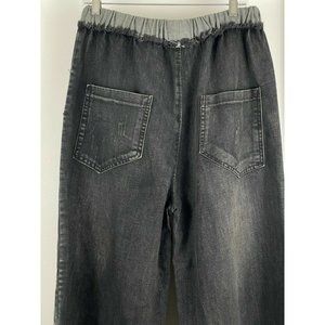 Loose fit, boho, ripped jeans, with embroidery and fraying at hem. Pull on elastic waist smoky gray black pant with pockets.