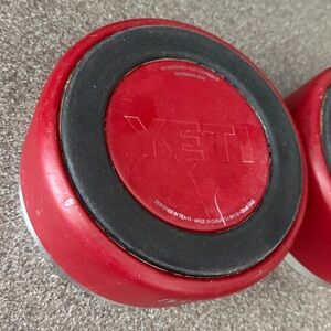 Sturdy YETI pet bowl with maroon exterior. Stainless steel inside.
