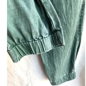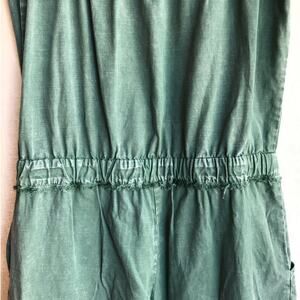 YFB jumpsuit in very good condition, no flaws noted. Ivy, or military green, color, features jogger style cuffs and tiny fringe detail at waist and top. Slightly cropped. 15 inches across at waist, but stretches out to 17 or so, 14 at top (but stretches) 11.5 rise and 28 inch inseam.