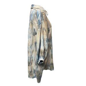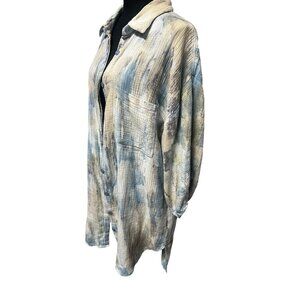 This lightweight, versatile shirt jacket features a unique tie-dye design, textured cotton blend fabric, and a relaxed fit. Its button-down style and collared neckline make it suitable for layering or casual styling.
