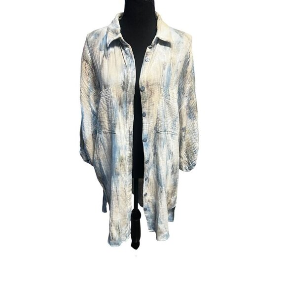 This lightweight, versatile shirt jacket features a unique tie-dye design, textured cotton blend fabric, and a relaxed fit. Its button-down style and collared neckline make it suitable for layering or casual styling.