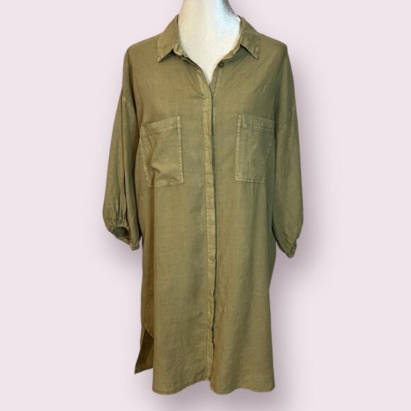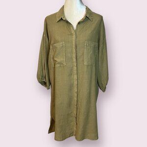 YFB Young Fabulous &Broke Linen Shirt Dress Olive Green Button Front Oversize M