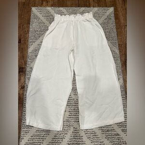 Pre-owned condition, size M, no material tag but it seems to be a linen blend, two front pockets, elastic waist band, pull-on style, belt loops, semi sheer. casual spring summer beach wear cruise wear resort wear breathable lightweight . A1
