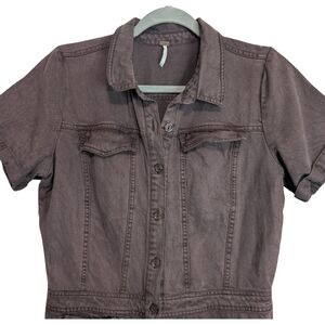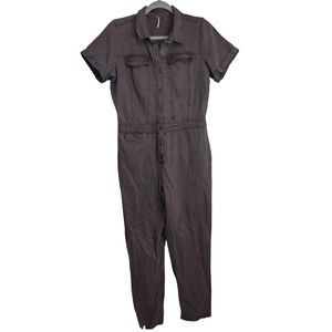 YFB jumpsuit, utility coverall, brown denim jumpsuit, workwear jumpsuit, button front jumpsuit, short sleeve jumpsuit, cropped jumpsuit, vintage inspired, boiler suit, utility suit, women's medium jumpsuit