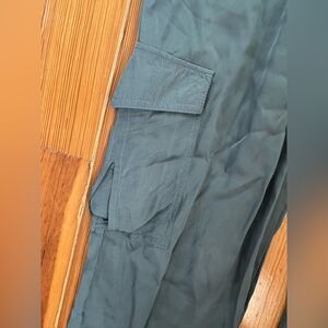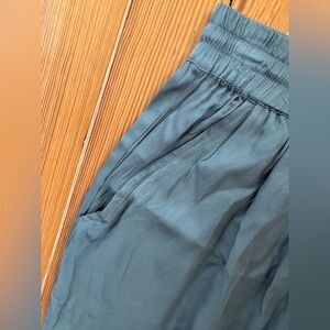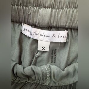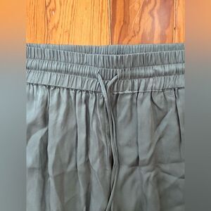 Lightly worn. Olive green in color. Silky feel. Pockets. Elastic waist. Size S