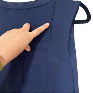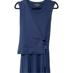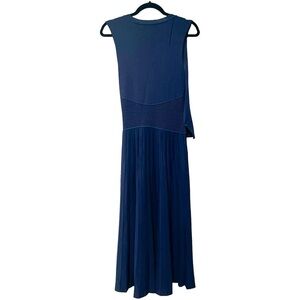 This is a Yigal Azrouël dress. Yigal Azrouël is a New York-based fashion designer known for his minimalist aesthetic, expert draping, and use of high-quality fabrics. The dress in the image appears to be a sleeveless, navy blue, maxi dress with a pleated skirt and a cinched waist detail. The brand is known for its feminine yet strong designs, often featuring architectural silhouettes. Azrouël draws inspiration from art, culture, travel, and his hometown of New York City