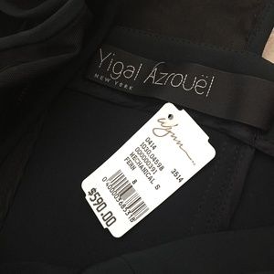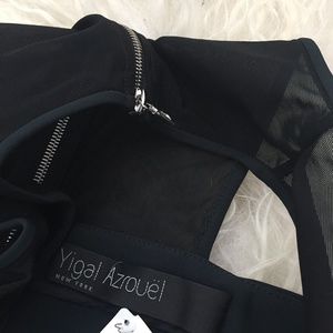 Green and black Yigal Azrouël Mechanical sleeveless top featuring Semi-sheer mesh panels at top, plunging neck and silver-tone exposed zip closure at center back.