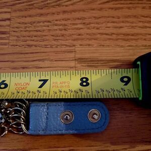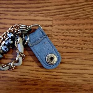 Special Features: Multi-Strand, Two Gold chain link strands, Crystal strand, Gray Leather entwined strand, and Faceted Pewter strand, Blue/Gray Leather Band, Snap Closure, Adjustable