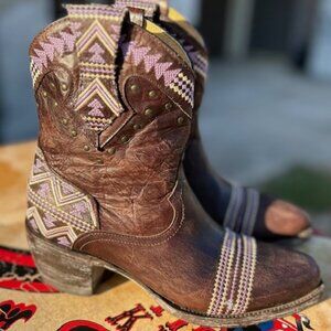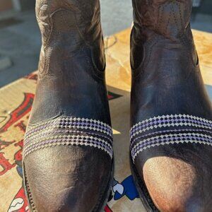 Chocolate brown leather with lavender and white Aztec accent stitching and lightly distressed accenting. This bootie is super comfortable with a nice heel height that is very easy to maneuver on & off the dance floor; extremely comfortable. Since they are ankle boots you can wear them all year long- with shorts, skirts, jeans- they look good with just about everything.