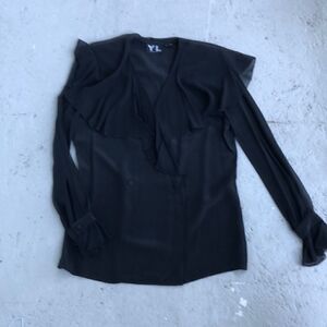 Beautiful lightweight sealed with a ruffle collar, use it as a shirt or is it a jacket. Just hit up dress it down. Has very slight padding in the shoulders. Sheer sleeves with ruffle
