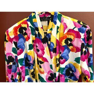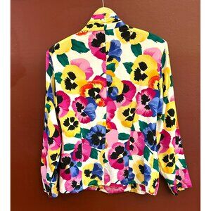 This silk blazer features a bold multicolor floral pansy print, offering a lightweight, breathable option for layering. Its elegant design includes a button front and a tailored fit.
