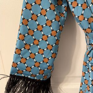 YMHY robin egg blue loungewear dress/ jacket/robe in striking geometric pattern. Features black ostrich trimmed cuffs, shawl collar, matching tie belt, black trimmed front pockets and fully lined. Can be worn open without the belt.