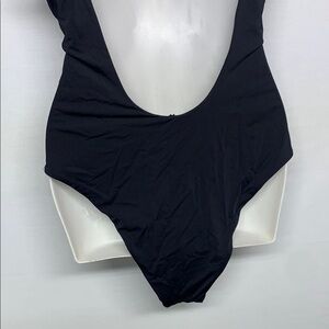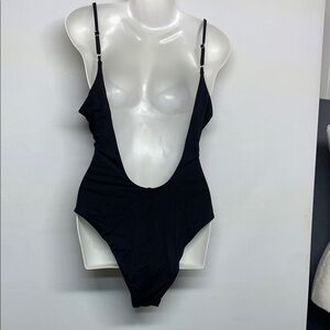 Chic black one-piece with stylish cut-outs. Features strappy design and ring accents. Perfect for a bold beach look.