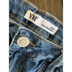 YMI Medium Wash Mini Denim Skirt With Stretch Size 7 or 28. In good preowned condition.