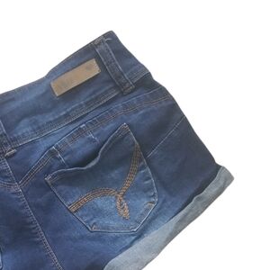 YMI Wannabettabutt? Size 9 Distressed Cuffed Dark Wash Mid Rise Jeans Shorts.