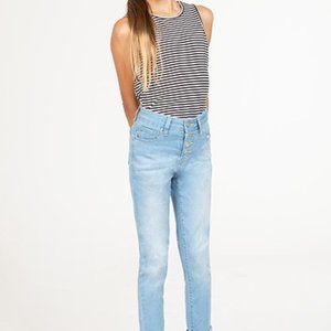 Our Girls' High-Waisted Button-Fly Denim Ankle Jean with Rolled Cuffs. Featuring five-pocket construction, four-button up button fly, rolled cuffs at hem, and belt loops.