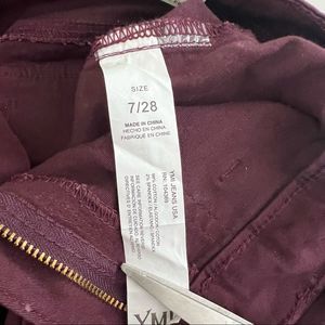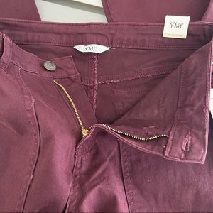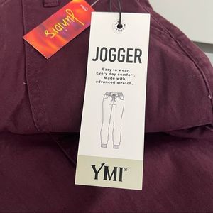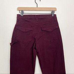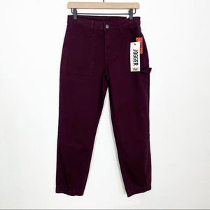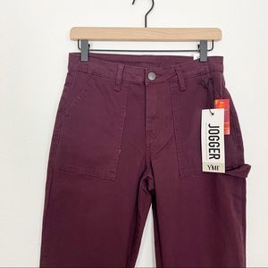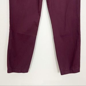 Twill joggers in a dark burgundy color with deep side pockets, front zipper and button closure, belt loops and two buttoned back pockets. Gathered cuffs and carpenter loop detail at left pant leg. Soft and stretchy.