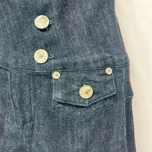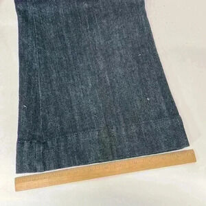 Dark wash wide leg almost bell, bottom jeans inseam, 34 inches rise 13 inches sailor buttons at the waist adjustable back for fit dark colored. We’re at the bottom goes to 12 inches bit of a smoke or a musty smell might come out in the wash I have not washed them yet.