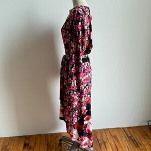 Details: Magenta, black, Orange, and white floral print on a silky, long-sleeve, button to the waist, just below the knee length dress with belted tie waist and high-low hem. Great office wear for the creative or creative field, wonderful feminine and modest maximalist dress.