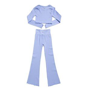 pants: pull on, fabric provides stretch, flare leg, ribbed construction, elastic waisbtand