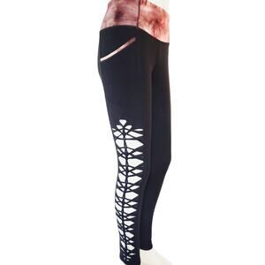 Super CUTE and perfect for your next Yoga Session. We've dubbed her "Yogini". Cut and weaved throughout!! Waist band has been tie dyed Hot Pink. These leggings come with 2, 7.5 inch deep front pockets and a concealed inside front pocket as well. These will fit comfortably around your waist and offer tummy control as well! NON-SEE THROUGH LEGGINGS great for yoga wear, club wear, or for just lounging around. Only a limited amount available!
