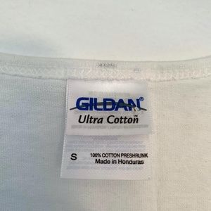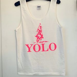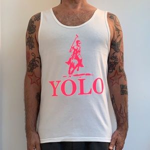 YOLO Tank Top / Muscle Tee / Sleeveless T Shirt, Gildan White w Pink Logo / lettering, size Small, 100% Cotton. - Super cool FUN Polo Parody with a Urban Take on the brand ! Hip Hop Urban Streetwear ! Excellent, gently pre-owned clean, no stains, rips or issues ! From home smoke and pet free. Measurements for fit taken when shirt was laid flat ( see last photo as measurement guide )W: 19", L: 27"