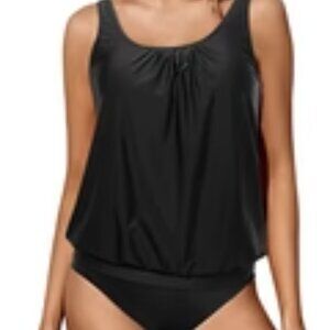 YONIQUE BLOUSON TANKINI SWIMSUIT SET Solid Black Scoop Neck Ruched Blouson Top and Standard Rise Swim Bottoms 2 Piece Tankini Swimsuit Set PLUS SIZE XXL NWT