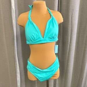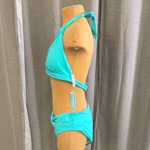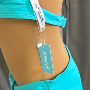 Stylish YONIQUE aqua bikini with halter top. Ideal for beach days.