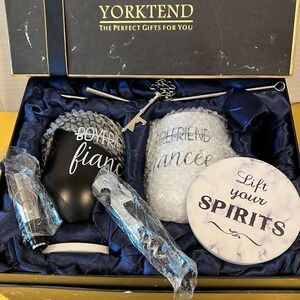 Boyfriend Girlfriend Fiancée Drink Glass set. Includes 2 cups, coasters, straws, corkscrew, key, pourer. In a gift box. Box is intended to look this way.