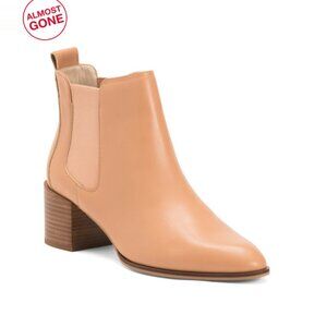 leather lining, stacked block heel, pull on loop, padded footbed, stretch side panels