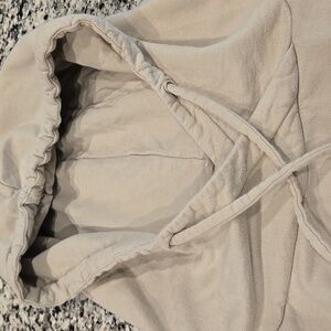 The sleeves have a snap closure so you can roll them up. Crossover neckline with drawstring hoodie. Hi-lo hem. Tan color. Dolman sleeves. Boxey look. Oversized.