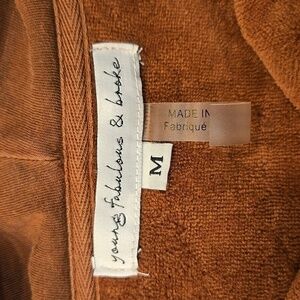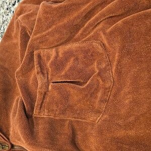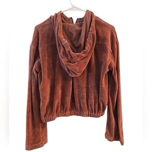 Pre-owned. Very good condition. Brown zipper jacket. Drawstring hood. Elastic hems. Cropped. 2 chest pockets. Velour. Size medium. Color is a beautiful brown.