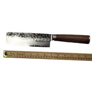 Brand new! This 6.5-inch Nakiri knife by YOUSUNLONG features a beautiful oak wood handle and a blade made from 67 layers of Damascus steel. The knife is perfect for cutting vegetables and other ingredients with precision and ease. The blade length measures at 12 inches and is a part of the Max Chef's Knives collection.
