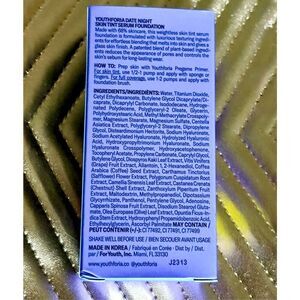 YOUTHFORIA Date Night Skin Tint Serum/Foundation in #390 - Medium Deep. This shade is neutral with warm undertones and for light-to-medium coverage. This is NWT and never used nor swatched. Full-size pump bottle, 1.38 fl. oz. It's silicone-free, fragrance free and weightless. Youthforia "Date Night" is formulated with 68% skincare actives, including hyaluronic acid. It's designed to provide a "glass skin" finish while controlling sebum for a long-term finish. Thus is said to be SAFE TO SLEEP IN and is suitable for all skin types, including sensitive skin. TO USE: Apply 1 to 2 pumps on the back of the hand and apply to face with a brush or sponge. This is a clean and sustainable brand, and it's NWT!