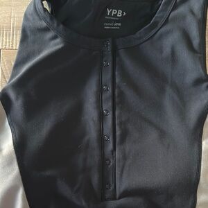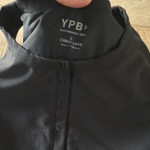Black and taupe workout top. Removable cups. Snap closure front. Cropped.